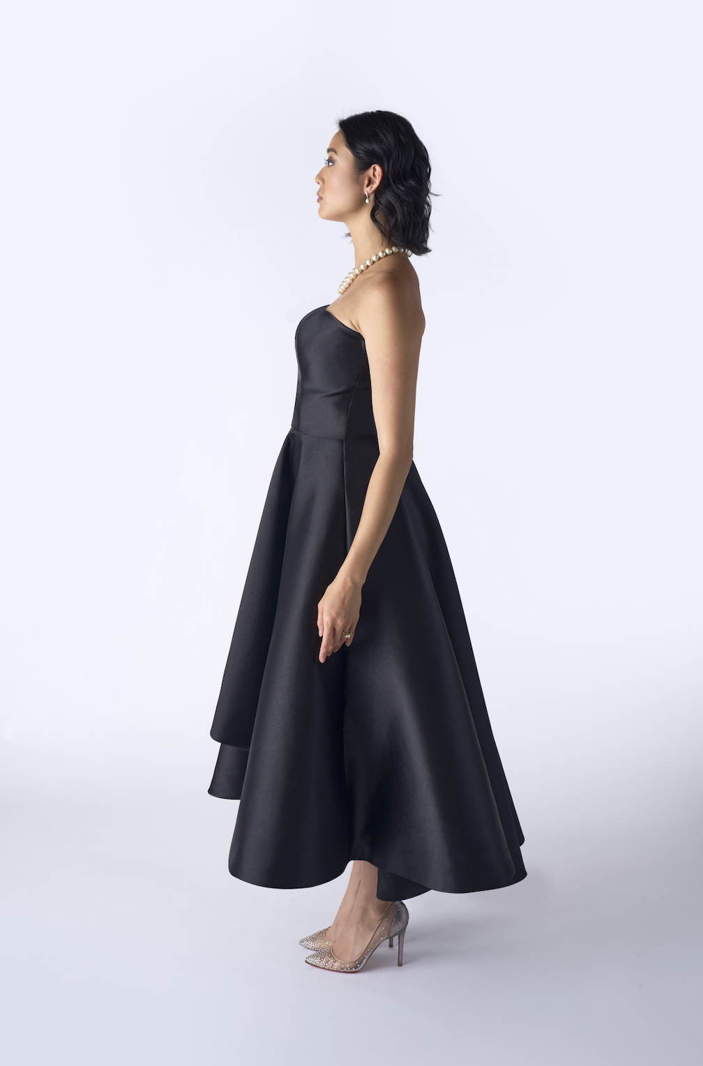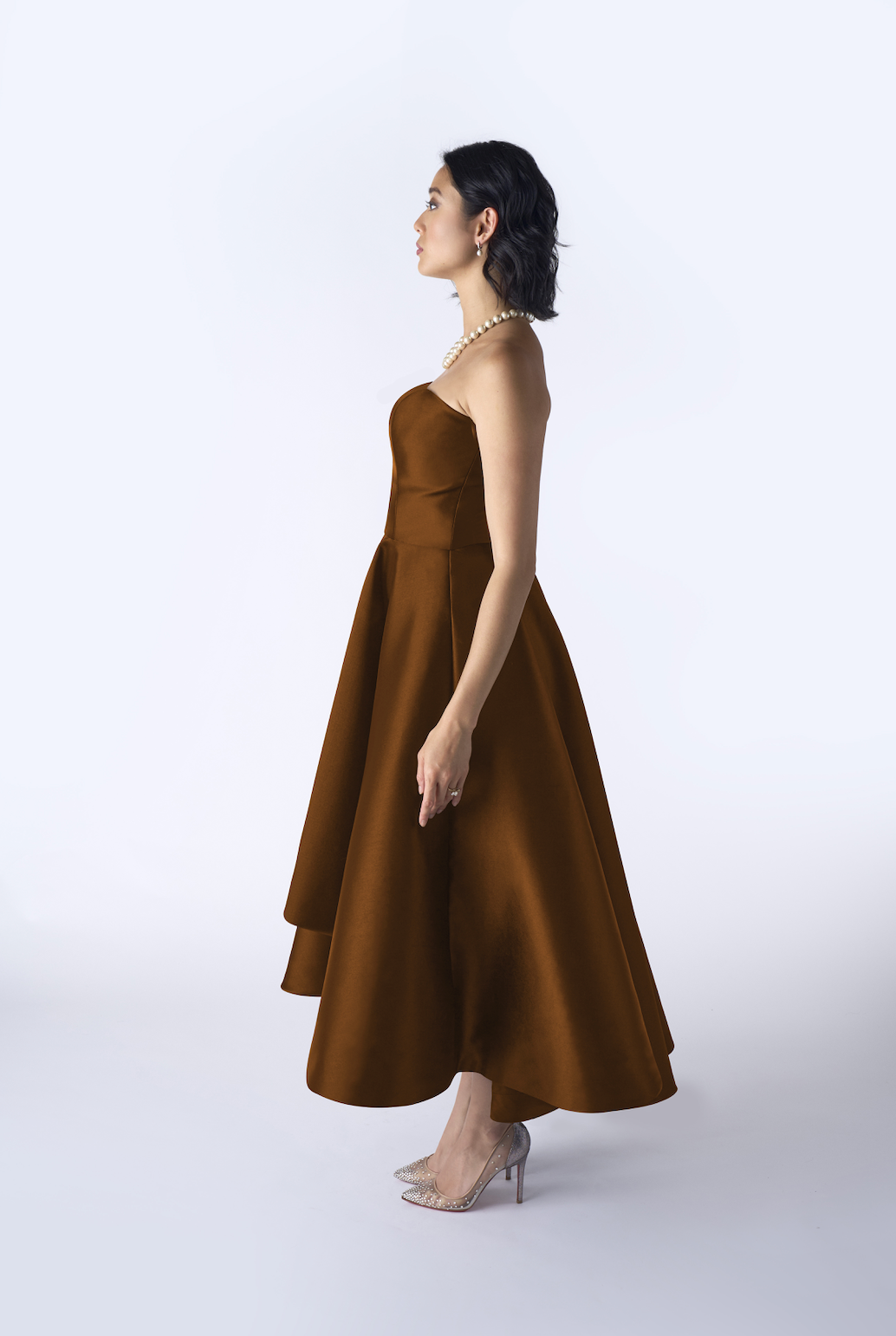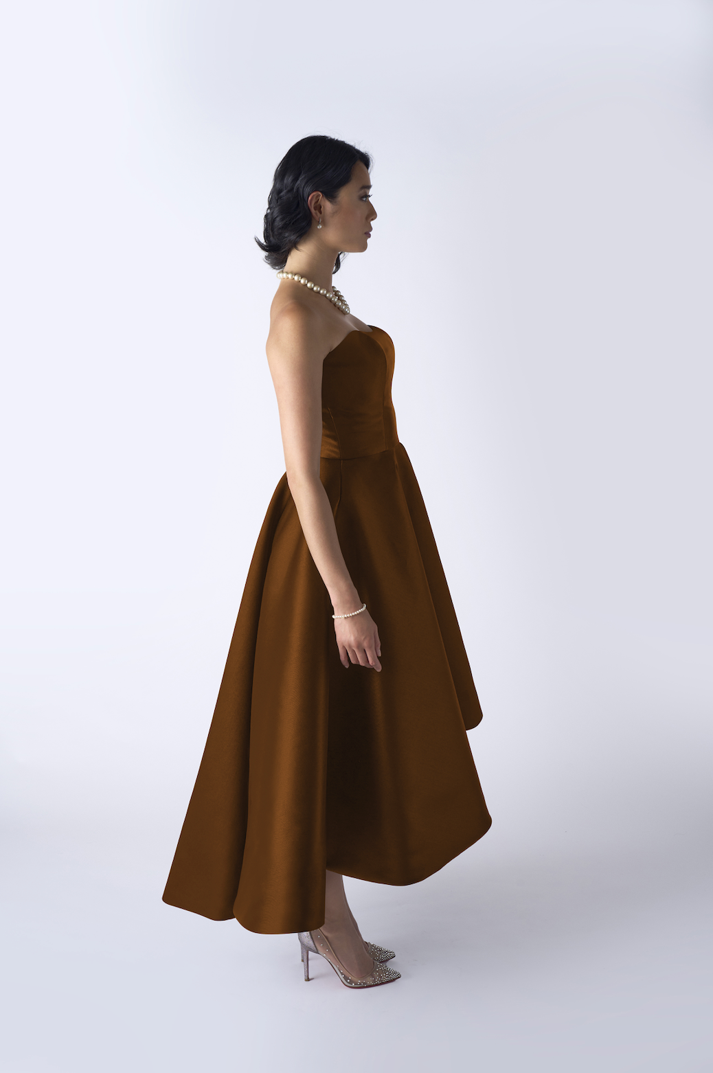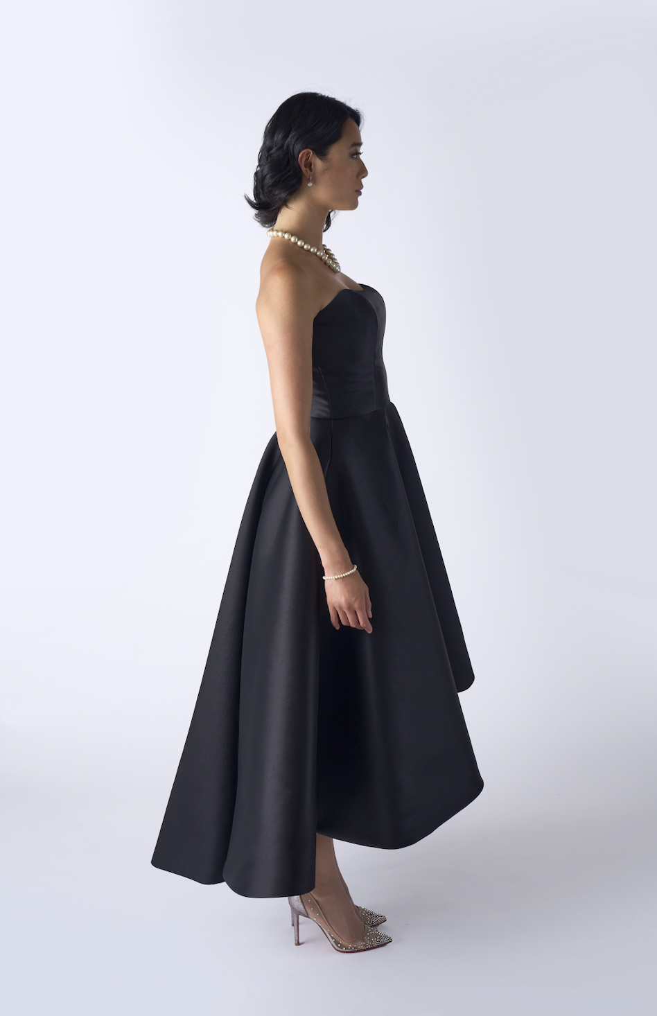 In the Reverie, clean lines and a dramatic, sweeping high-low skirt create a silhouette that feels both refined and romantic. Crafted from structured mikado, the sculpted strapless bodice defines the waist while the full skirt moves with effortless grace below. A built-in corset shapes and supports, while the bridal satin lining feels soft and smooth against the skin. Elegant without trying too hard, the Reverie is designed for black-tie evenings, weddings, and any occasion where you want to look unforgettable and timelessly romantic.
