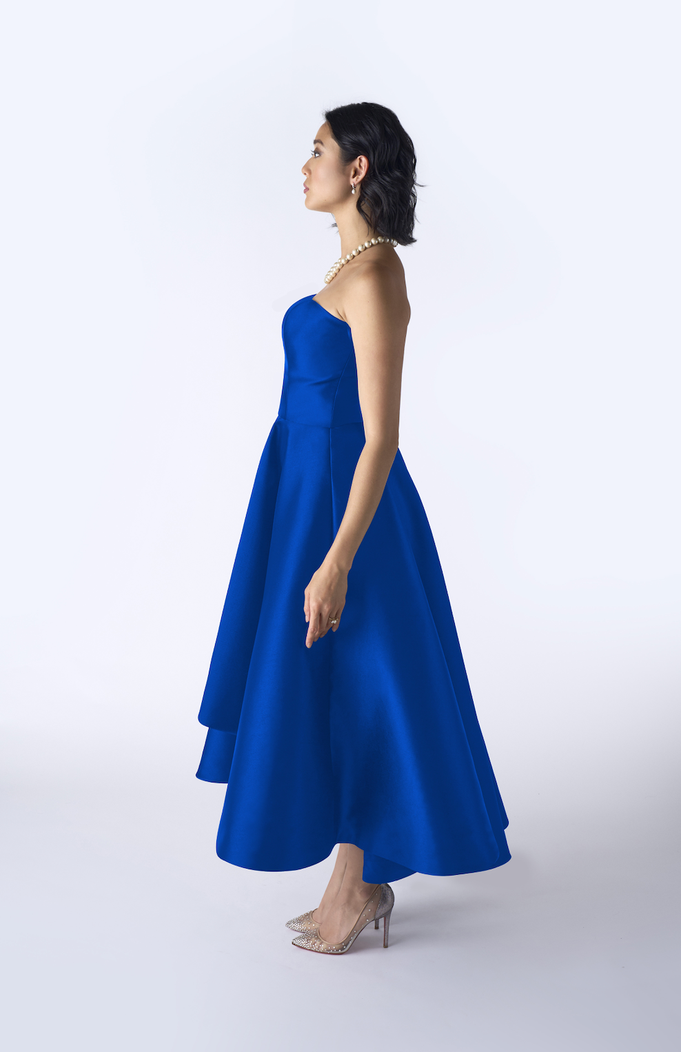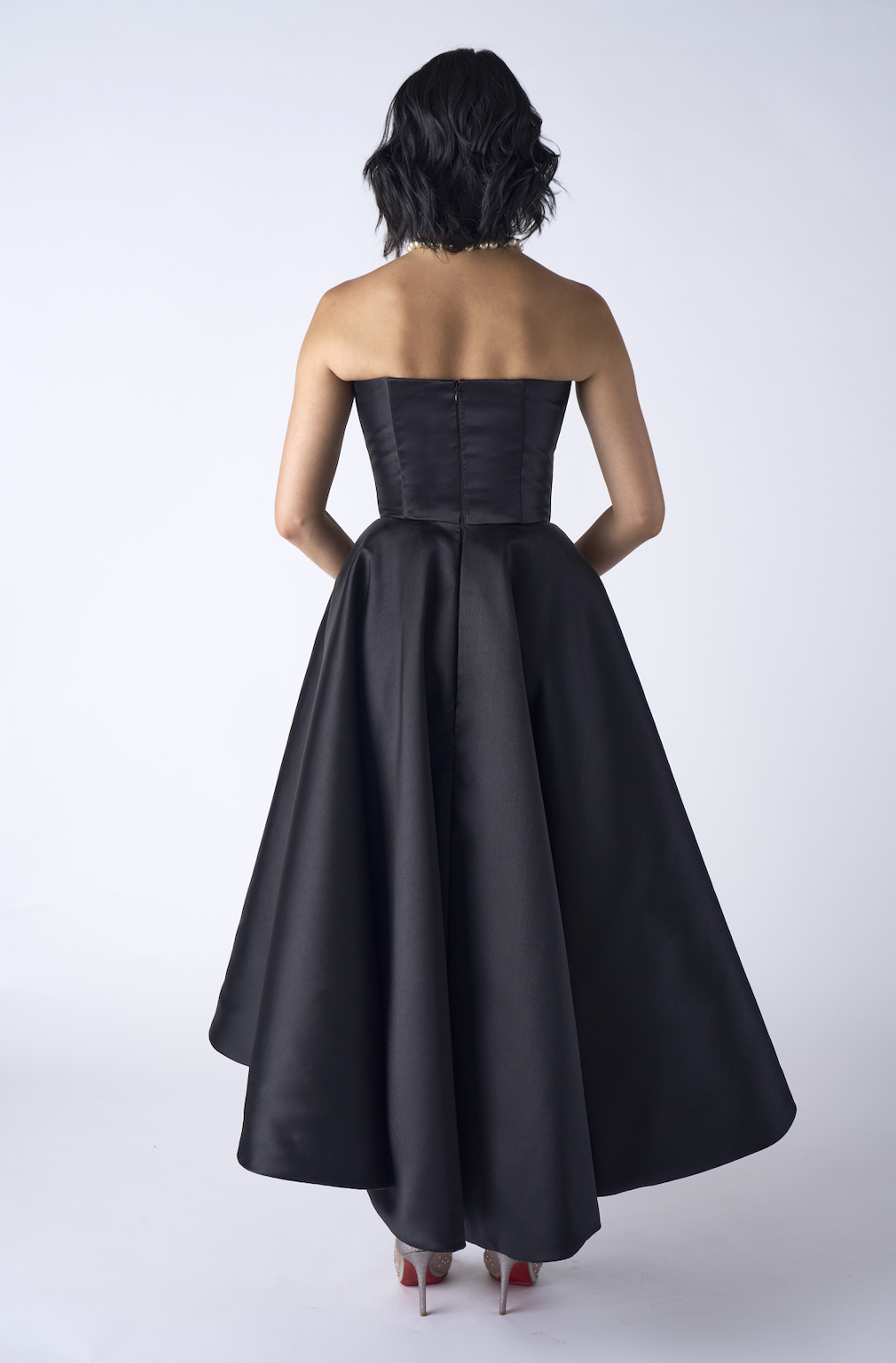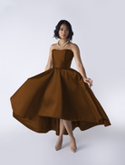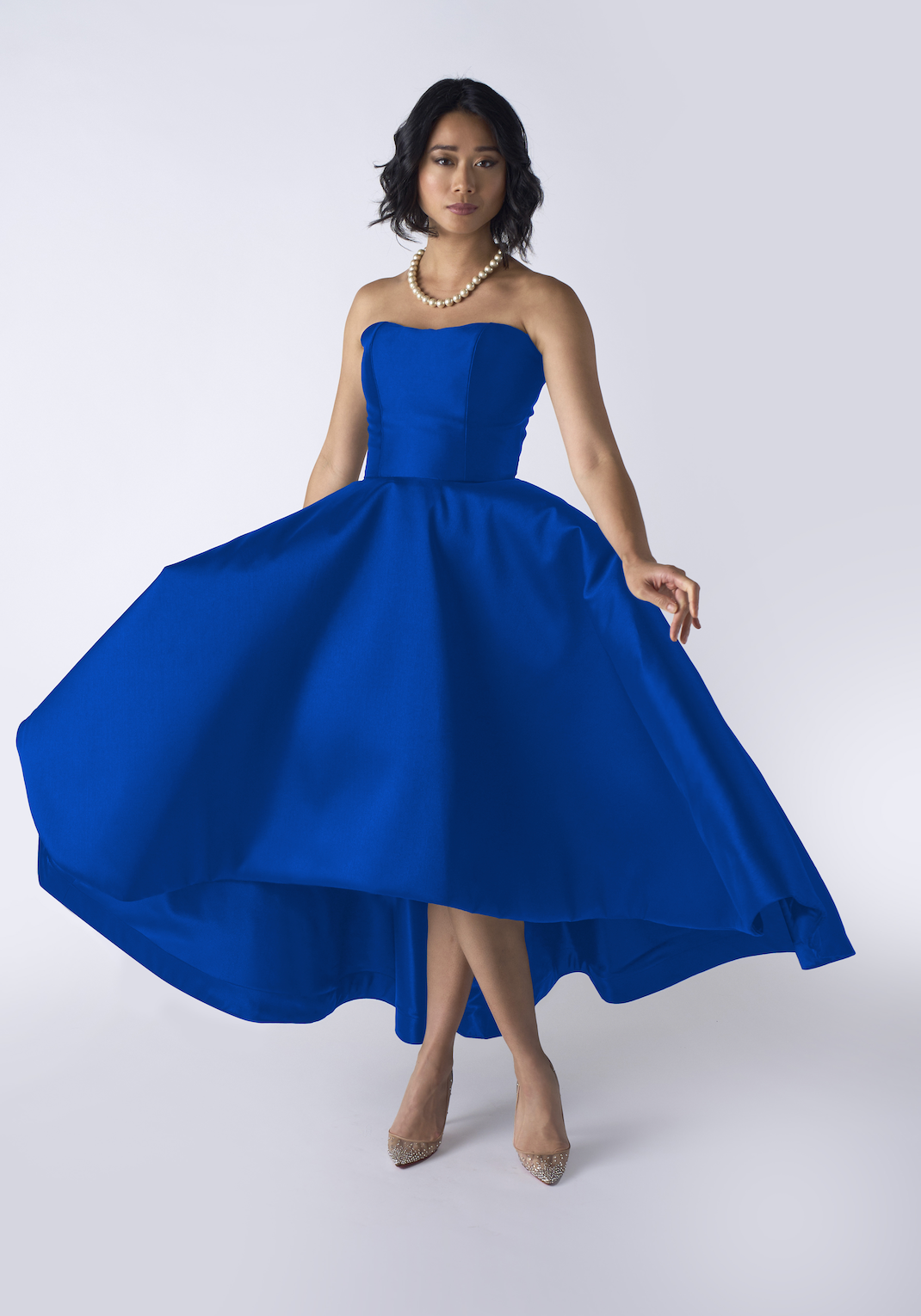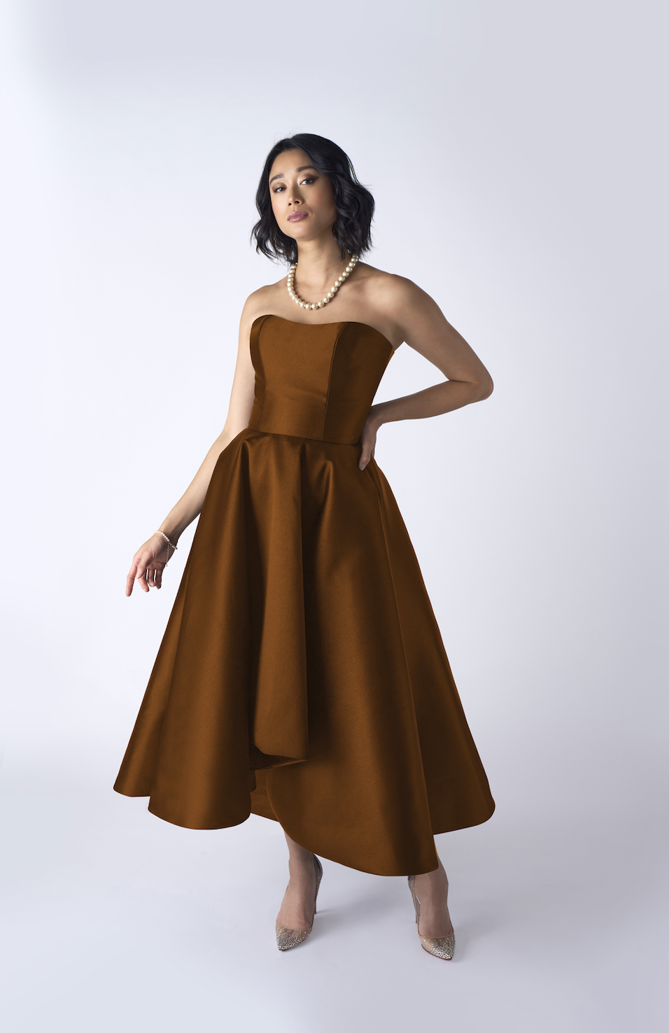In the Reverie, clean lines and a dramatic, sweeping high-low skirt create a silhouette that feels both refined and romantic. Crafted from structured mikado, the sculpted strapless bodice defines the waist while the full skirt moves with effortless grace below. A built-in corset shapes and supports, while the bridal satin lining feels soft and smooth against the skin. Elegant without trying too hard, the Reverie is designed for black-tie evenings, weddings, and any occasion where you want to look unforgettable and timelessly romantic.