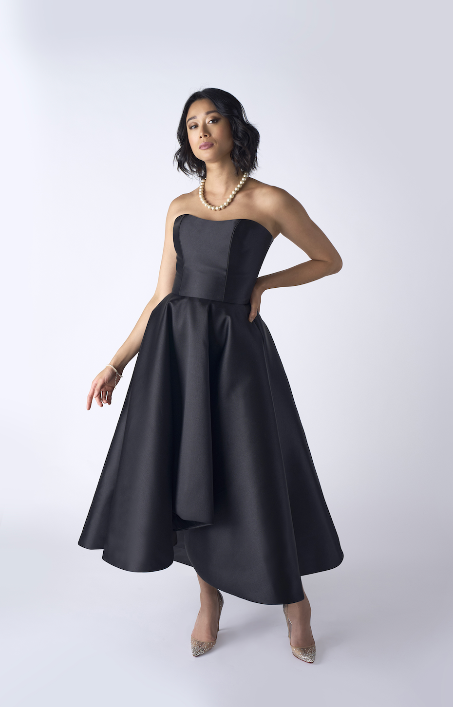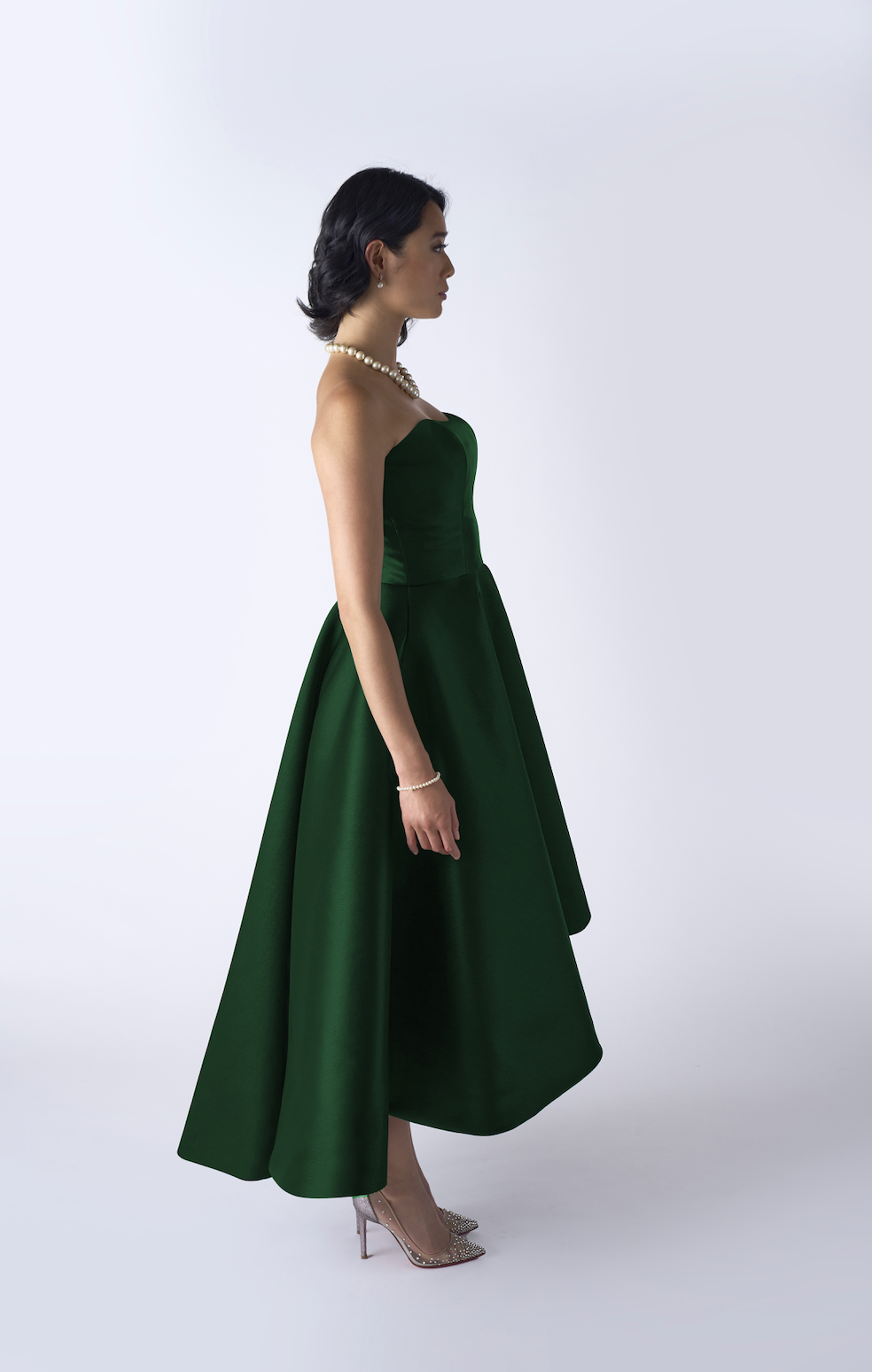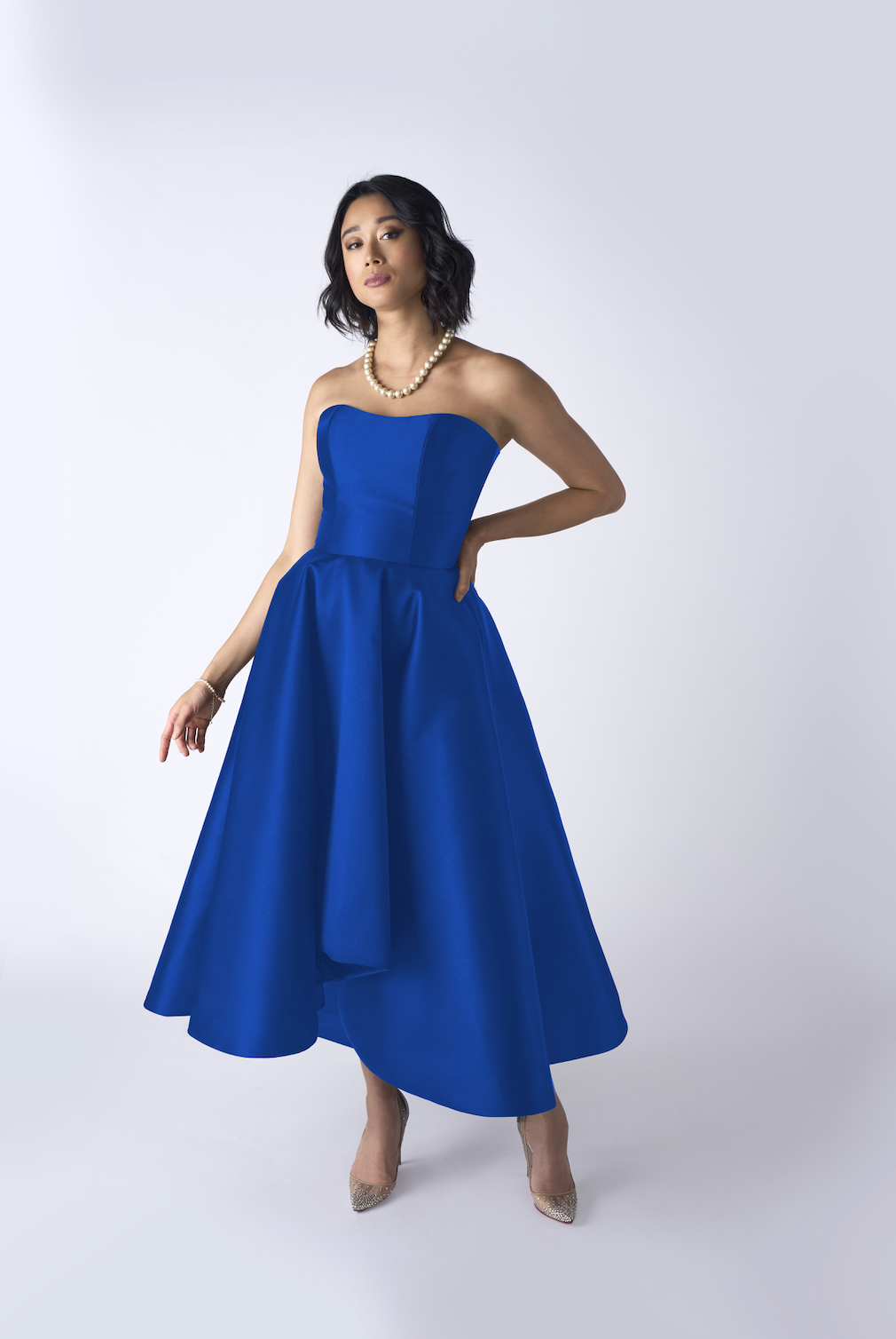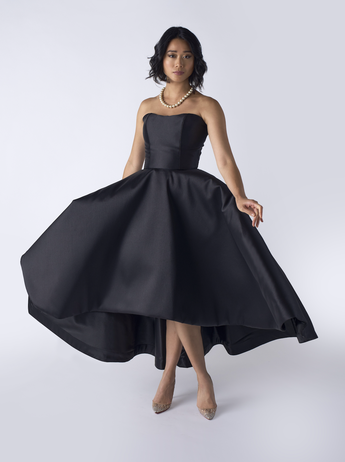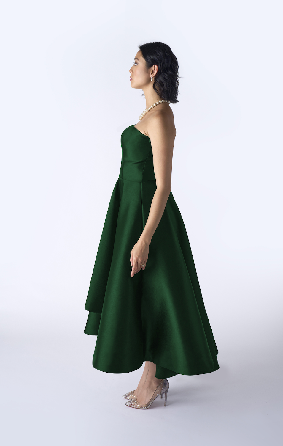 In the Reverie, clean lines and a dramatic, sweeping high-low skirt create a silhouette that feels both refined and romantic. Crafted from structured mikado, the sculpted strapless bodice defines the waist while the full skirt moves with effortless grace below. A built-in corset shapes and supports, while the bridal satin lining feels soft and smooth against the skin. Elegant without trying too hard, the Reverie is designed for black-tie evenings, weddings, and any occasion where you want to look unforgettable and timelessly romantic.