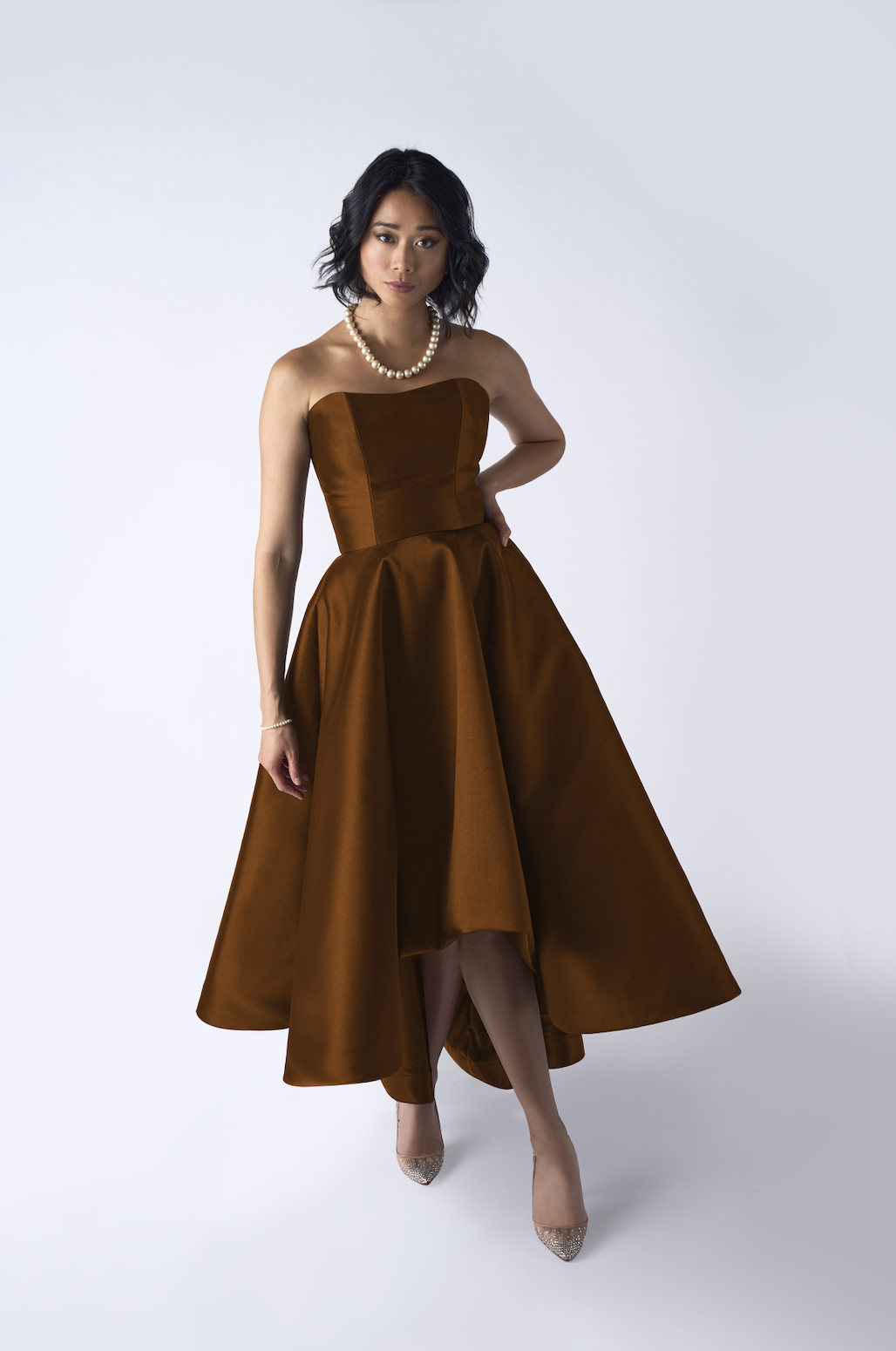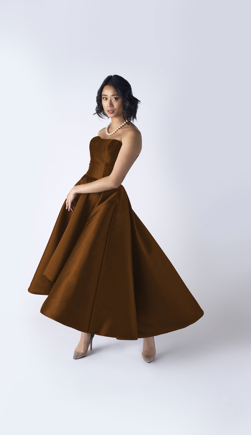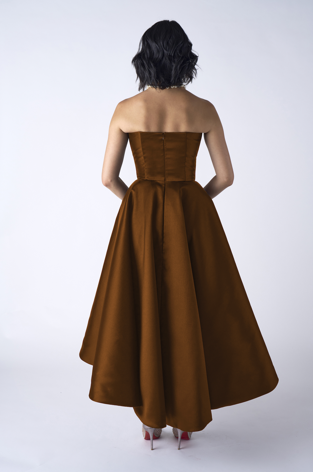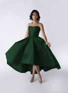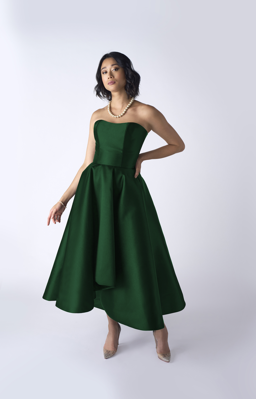 In the Reverie, clean lines and a dramatic, sweeping high-low skirt create a silhouette that feels both refined and romantic. Crafted from structured mikado, the sculpted strapless bodice defines the waist while the full skirt moves with effortless grace below. A built-in corset shapes and supports, while the bridal satin lining feels soft and smooth against the skin. Elegant without trying too hard, the Reverie is designed for black-tie evenings, weddings, and any occasion where you want to look unforgettable and timelessly romantic.