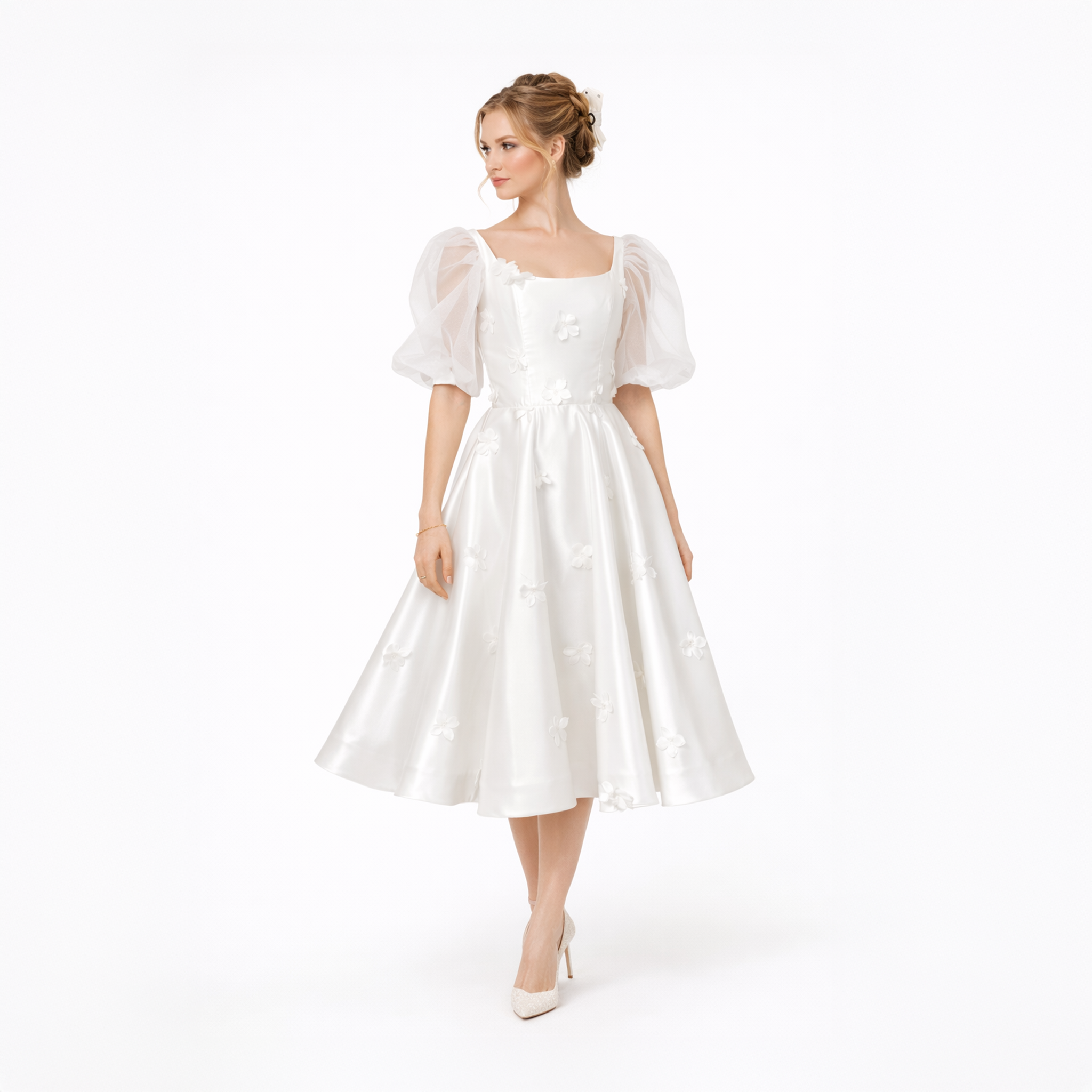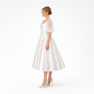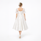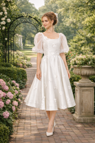 Sheer organza puff sleeves add softness and volume, balancing the structured bodice with a touch of vintage elegance. The skirt falls to a graceful tea length, offering movement and ease while maintaining a polished feel.