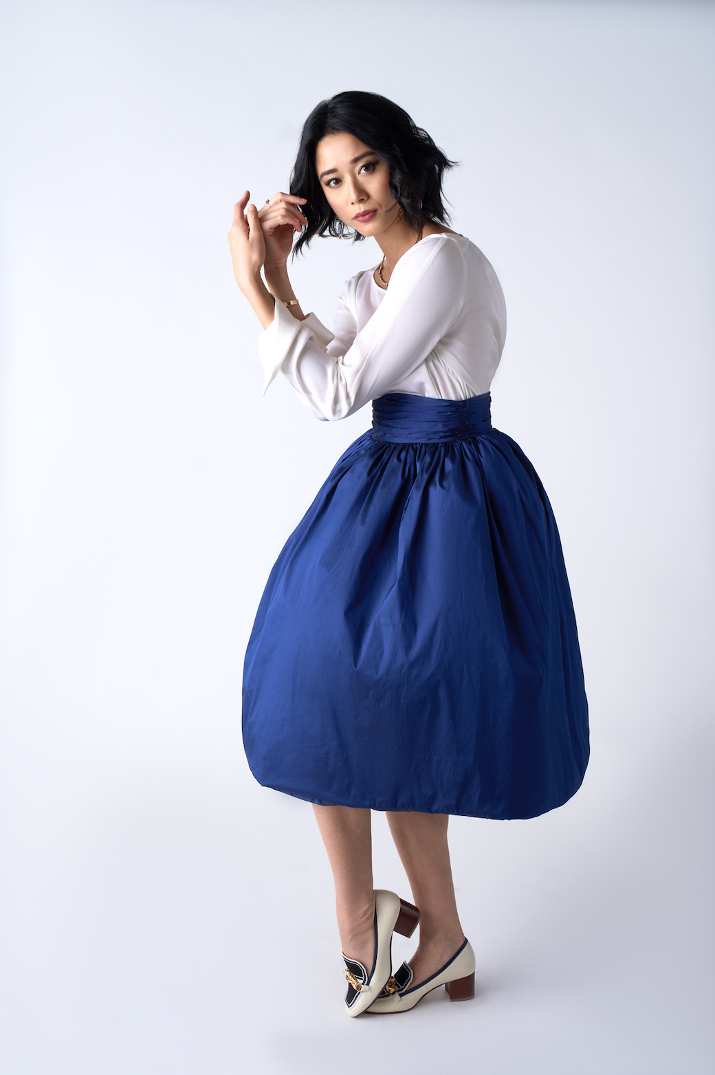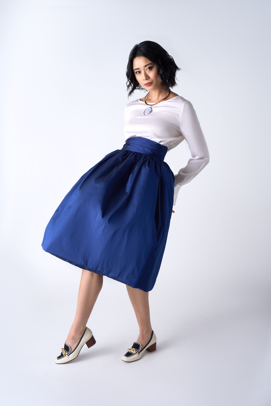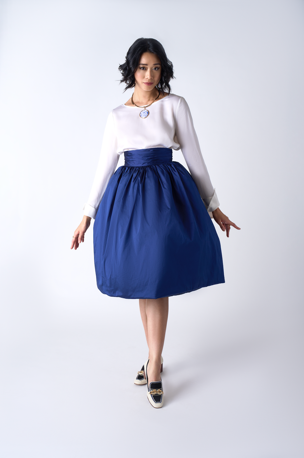 Designed for impact, the Derby Skirt pairs Southern heritage with sculptural couture shape. Cut from luminous silk shantung, the fabric offers a crisp hand and a slightly textured finish that enhances its architectural volume. Constructed in a traditional dirndl style, its fullness is refined by a wide, extra-high gathered waistband that sharply defines the waist. Subtle inner layers give the skirt its sculptural fullness without adding weight, creating the dramatic “bubble” silhouette. Falling to a polished midi length and finished with a smooth satin lining, the Derby embodies Page Lucky’s signature blend of grace, strength, and modern elegance.