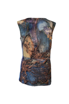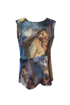 This asymmetrical cotton top draws inspiration from the cosmos, blending celestial prints with contemporary couture lines. Crafted from 100% cotton in shades of blue, gold, and beige, the silhouette slips on with ease while offering a sculptural, artistic presence. A bold pocket accents the right front, merging function with visual interest, and a dramatic diagonal seam sweeps across the body to enhance the asymmetrical shape.