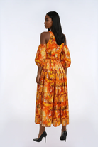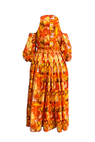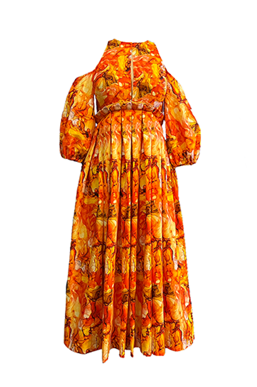 Flow like a goddess in beautiful orange and golden hues with this modern take on a box pleat dress. A dramatic plunging neckline adds a sulty feel to this romantic open shoulder design. Gathered sleeves allow you to choose the placement and fullness of your look. Enjoy the freedom and movement of the full skirt as you feel luxuriously draped within yardage of this modern orange and swirl printed cotton material.