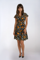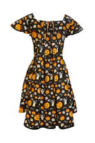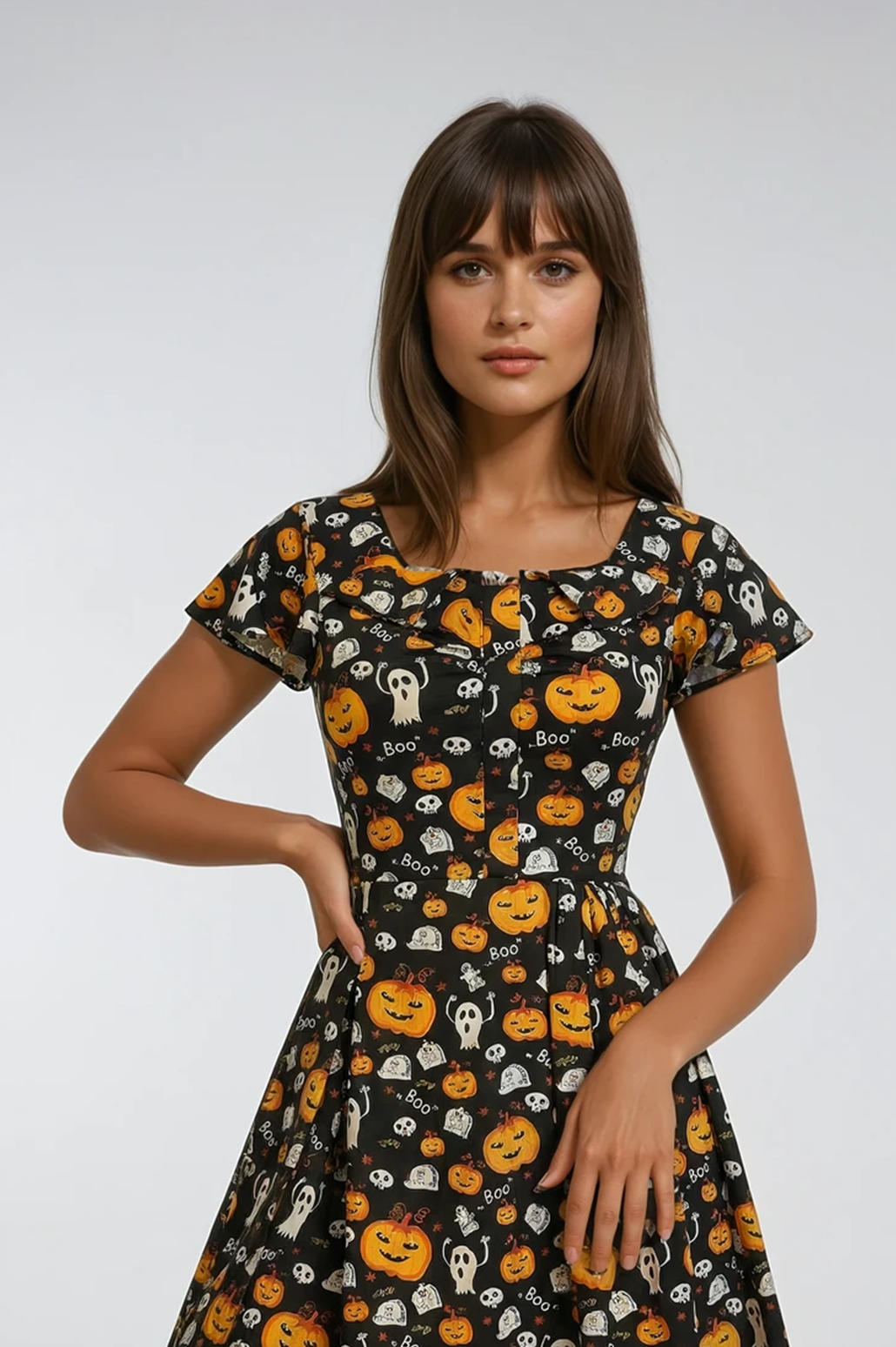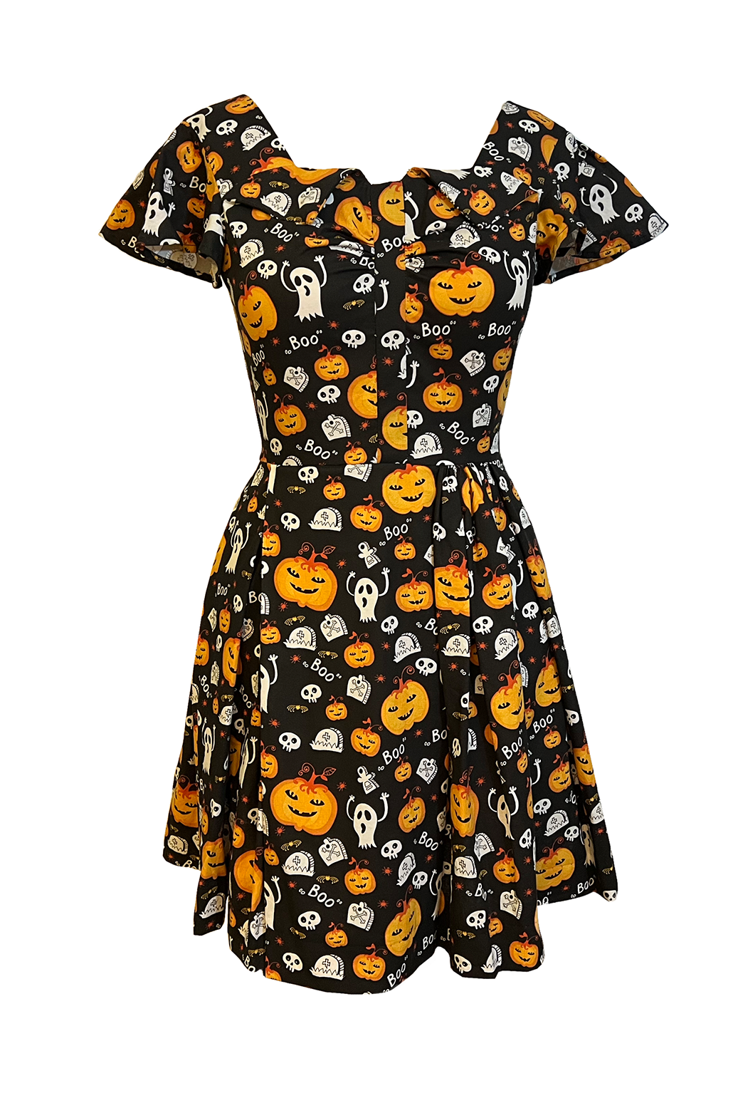 This one-of-a-kind cotton dress transforms whimsical gothic motifs into a striking couture silhouette. Designed in an orange and black pumpkin, skeleton, and skull print, the piece blends modern artistry with vintage-inspired structure. The asymmetrical skirt is engineered with pleats, gathers, and sculptural folds placed intentionally across the silhouette, creating movement and surprise from every angle. A retro collar adds a touch of classic rockabilly charm to the neckline, balancing the dramatic details below.