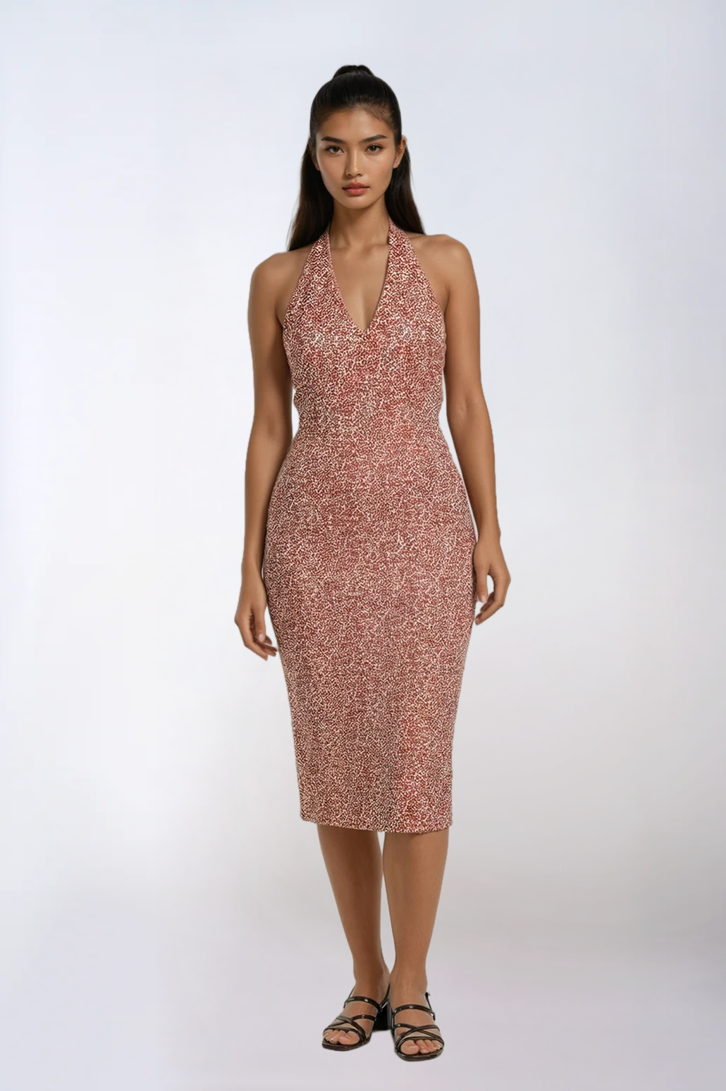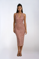This one-of-a-kind halter dress brings modern ease into a couture sensibility. Crafted from breathable 100% cotton, the silhouette balances softness and structure with a refined floral print that feels fresh, feminine, and timeless. The halter neckline frames the shoulders beautifully, while the open back creates an alluring line enhanced by a column of delicate buttons and two subtle hook-and-eye closures at the neck.